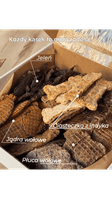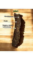 Miks przysmaków z jeleniem dla psów.Naturalny zestaw dla czworonożnych smakoszy.W środku znajdziesz wyłącznie naturalne, suszone w niskich temperaturach smakołyki:• Płuca wołowe (80 g) – lekkostrawne, niskotłuszczowe i bogate w białko, idealne do treningu oraz dla psów z wrażliwym układem pokarmowym.• Jądra wołowe (50 g) – naturalne źródło białka, przeznaczone do długiego żucia; intensywny, przyjemny aromat zwiększa zainteresowanie i zapewnia psu zajęcie na dłużej.• Jeleń (50g) – hipoalergiczne, chude mięso o wysokiej wartości odżywczej, polecane psom z wrażliwym żołądkiem lub skłonnościami do alergii.• Ciasteczka z indykiem (50g) – delikatne i lekkostrawne, idealne jako codzienna nagroda; indyk to dietetyczne źródło wysokiej jakości białka.